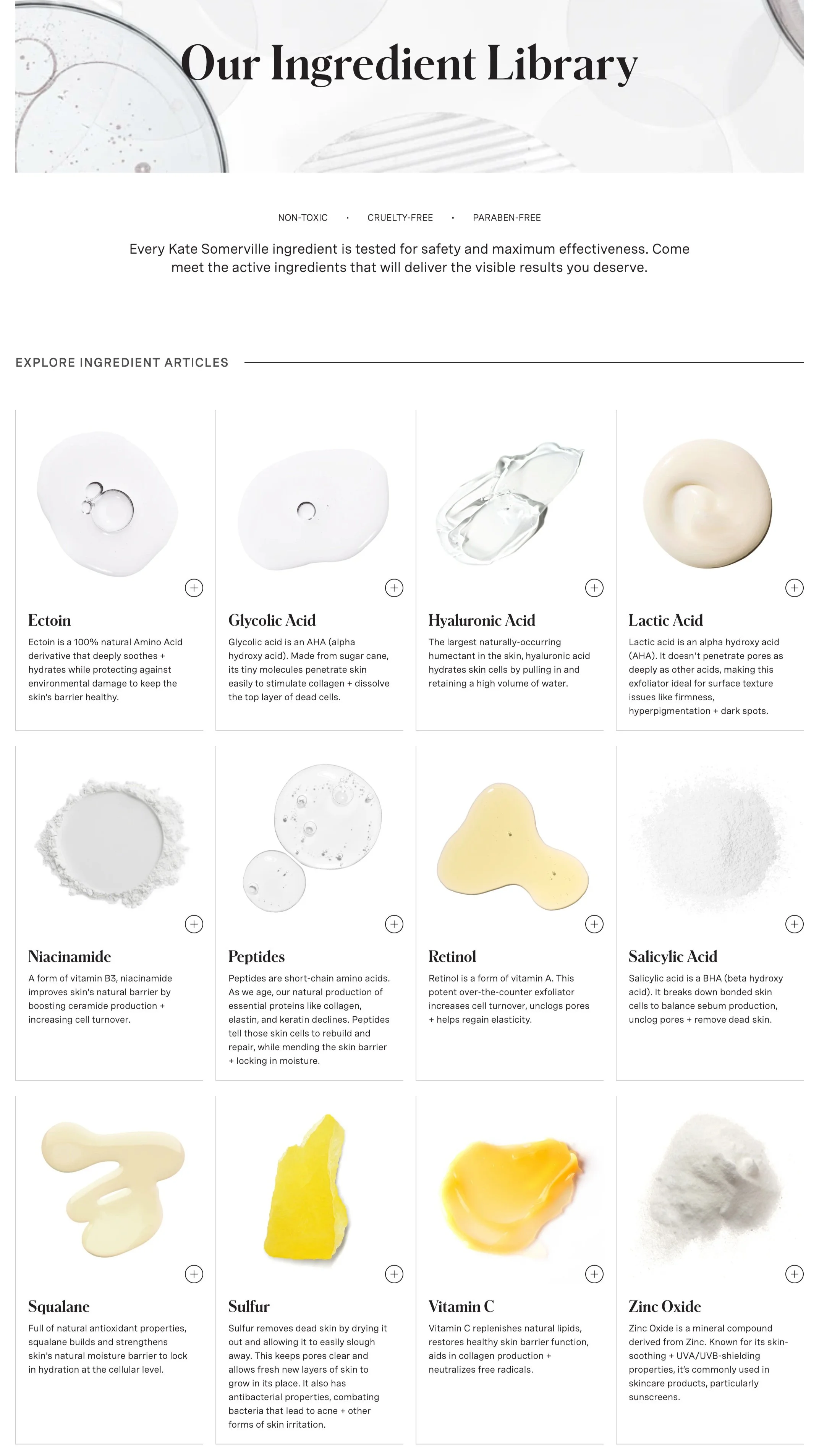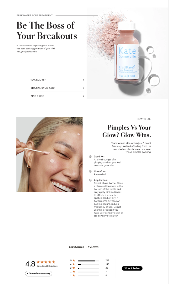 Speaks to Kate Somerville’s unique cleanical (clean + clinical) positioning + formulas
